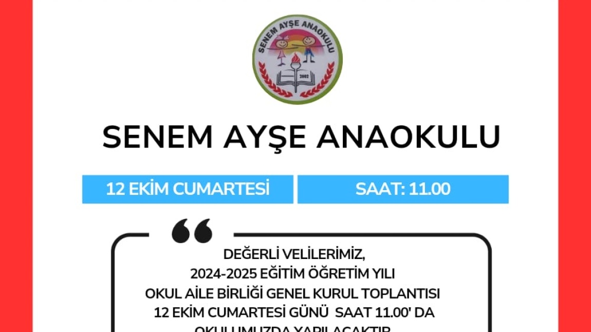 Senem Ayşe Anaokulu Okul Aile birliği toplantısı 12 Ekim Cumartesi Günü saat 11.00 da yapılacaktır. Tüm velilerimize duyurulur..